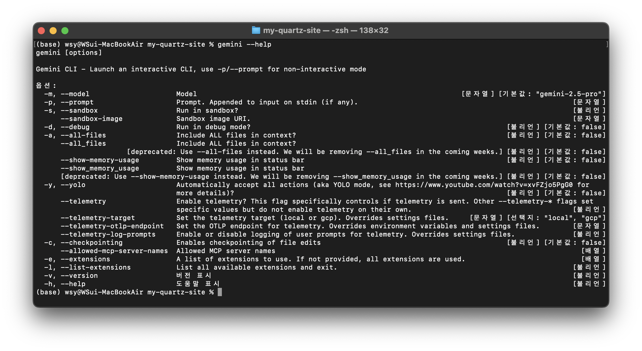 Gemini CLI์์๋ ๋ค์ํ ์ต์ ๋ค์ด ์กด์ฌํ๋ฉฐ ์ด๋ค์ ํตํด ๋์ํ๊ฒฝ ์กฐ์ ์ด ๊ฐ๋ฅํจ. ์๋์ ๊ฐ์ด ์ ๋ ฅํ์ฌ ๋ค์ํ ์ต์ ๋ค ํ์ธ ๊ฐ๋ฅ.